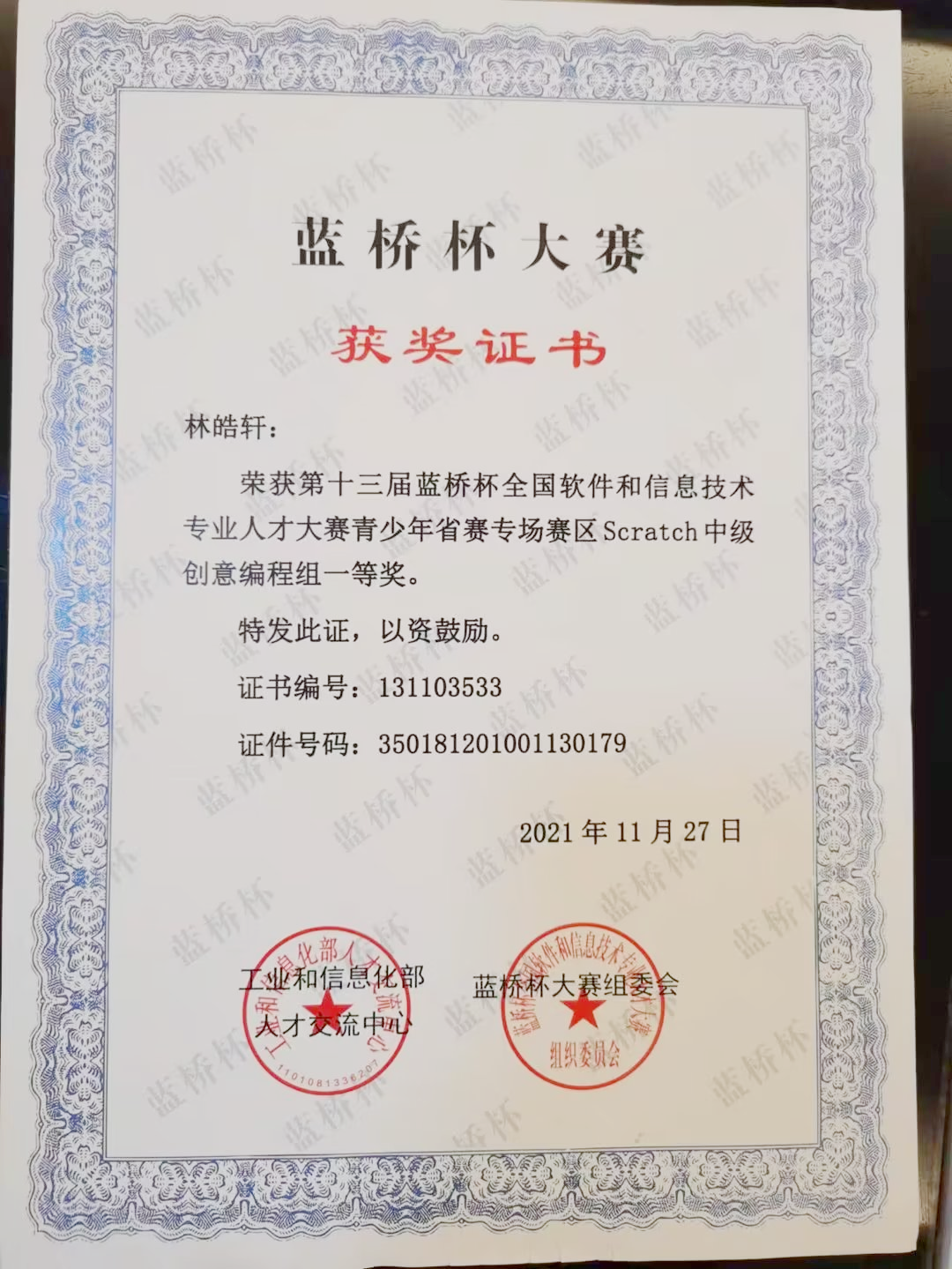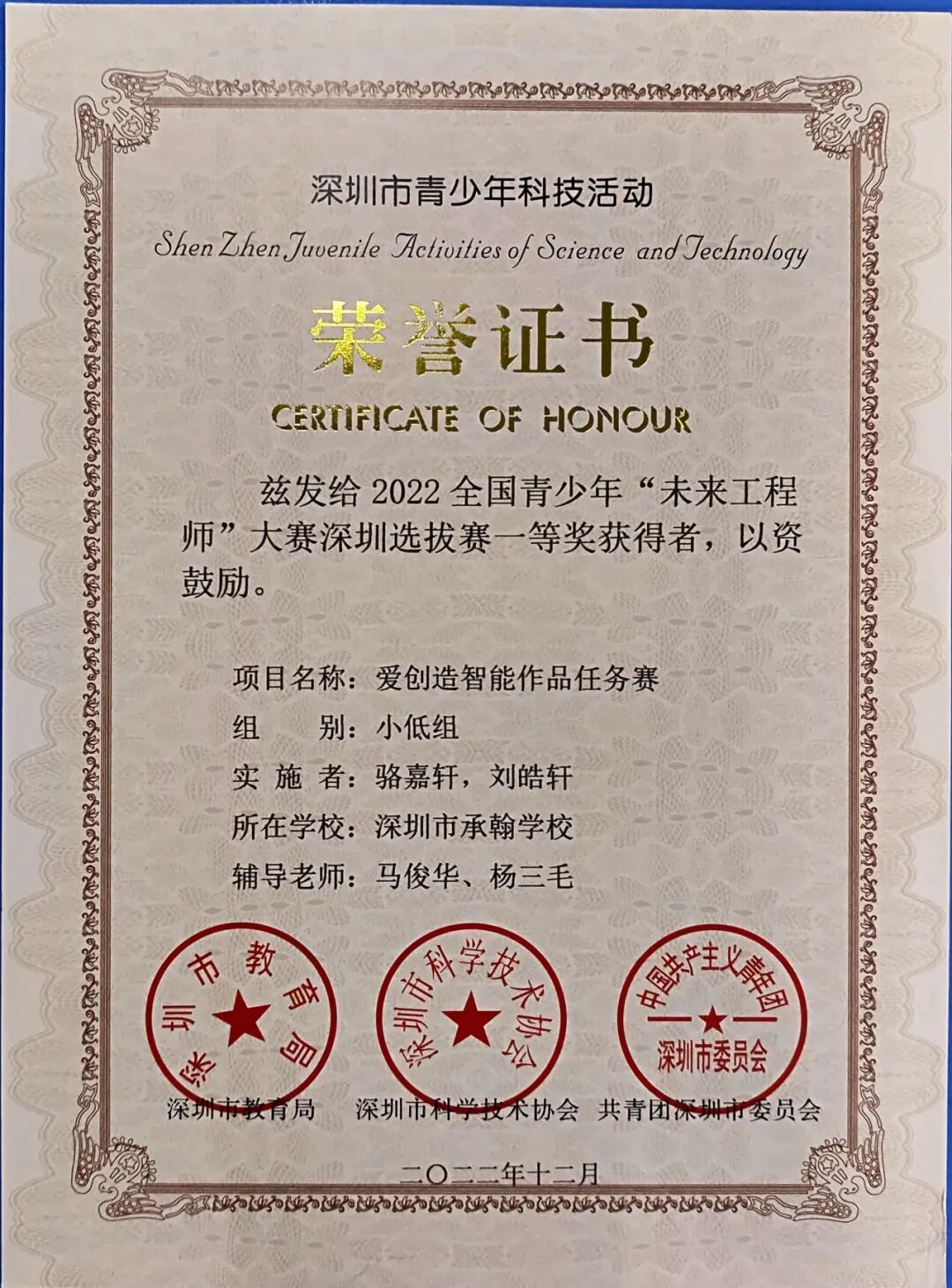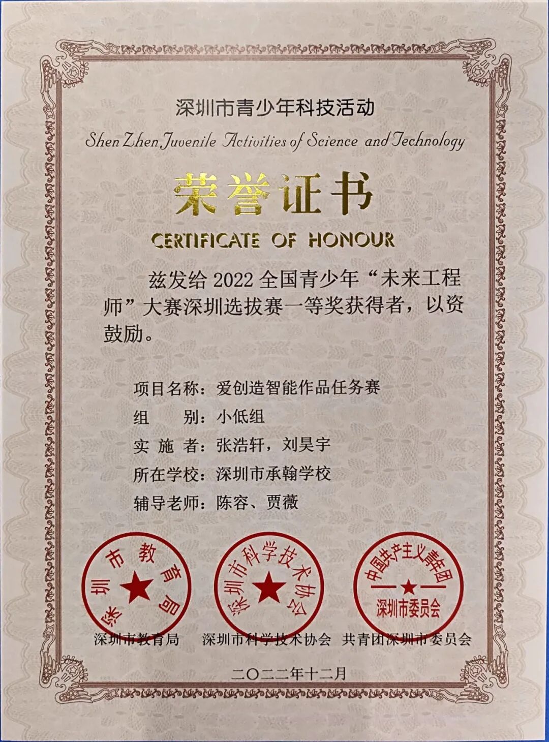 · 第五届全国青少年人工智能创新挑战赛、2021-2022全国青少年电子信息智能创新大赛总决赛等各项赛事中,荣获了多个一、二等奖。