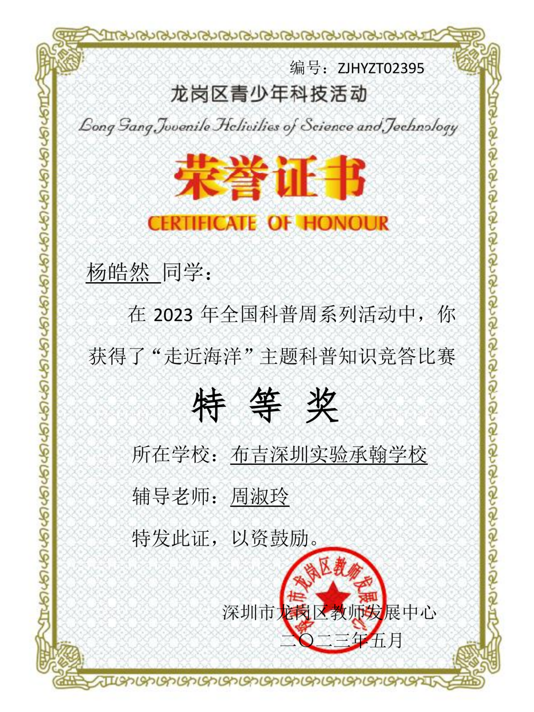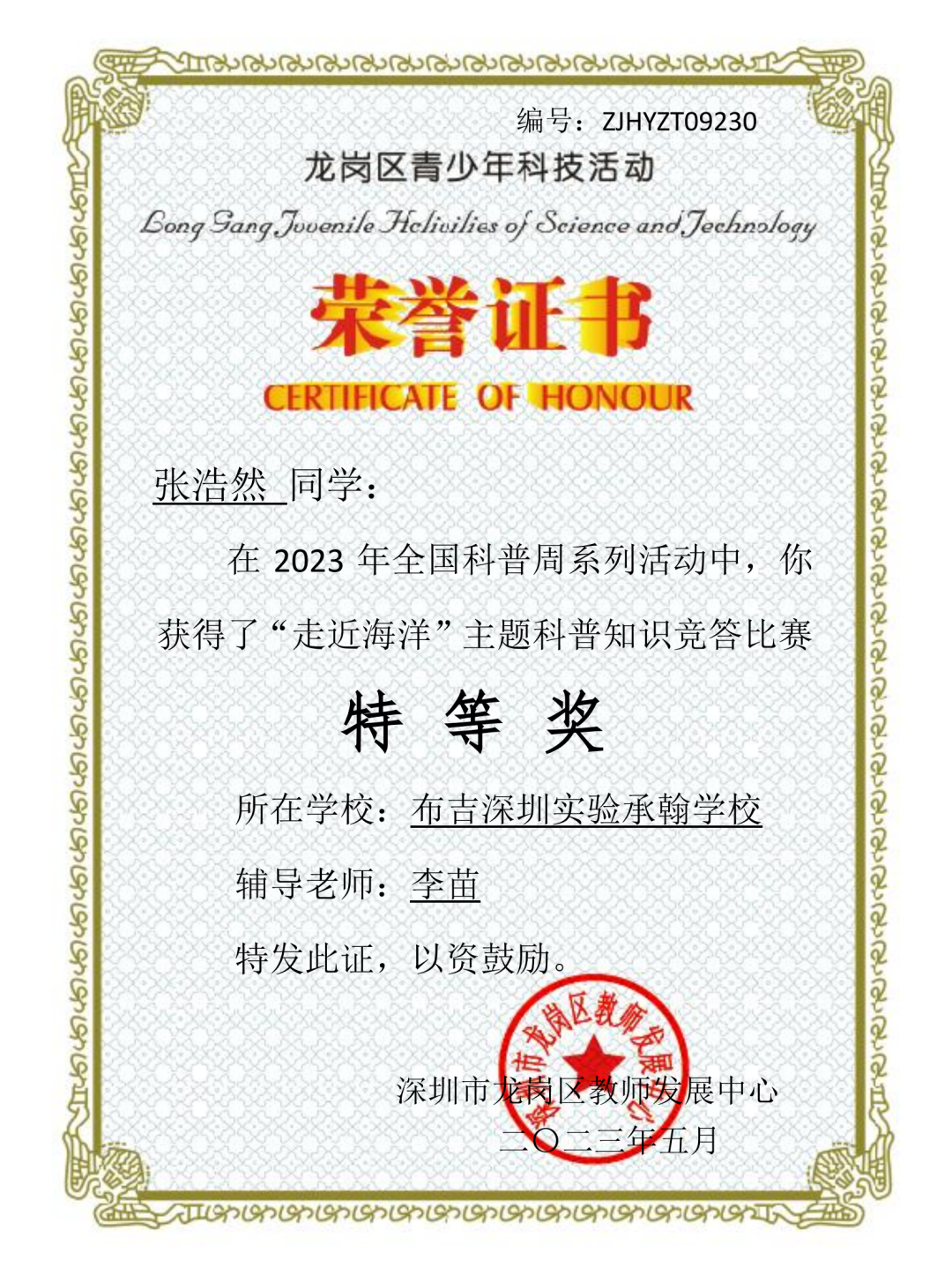 在龙岗区“走进海洋”科普知识竞赛中承翰师生积极参加比赛,累计1790人次参加比赛,有88名教师和596名学生获奖,成绩突出。承翰学校在本次评比活动中授予“优秀组织奖”。