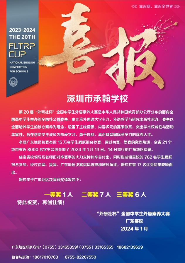 1月,第20届“外研社杯”全国中学生外语素养大赛广东省决赛落幕,承翰学子经过层层选拔和激烈角逐,最终取得了出色的成绩:1人荣获一等奖,7人获得二等奖,6人获得三等奖。