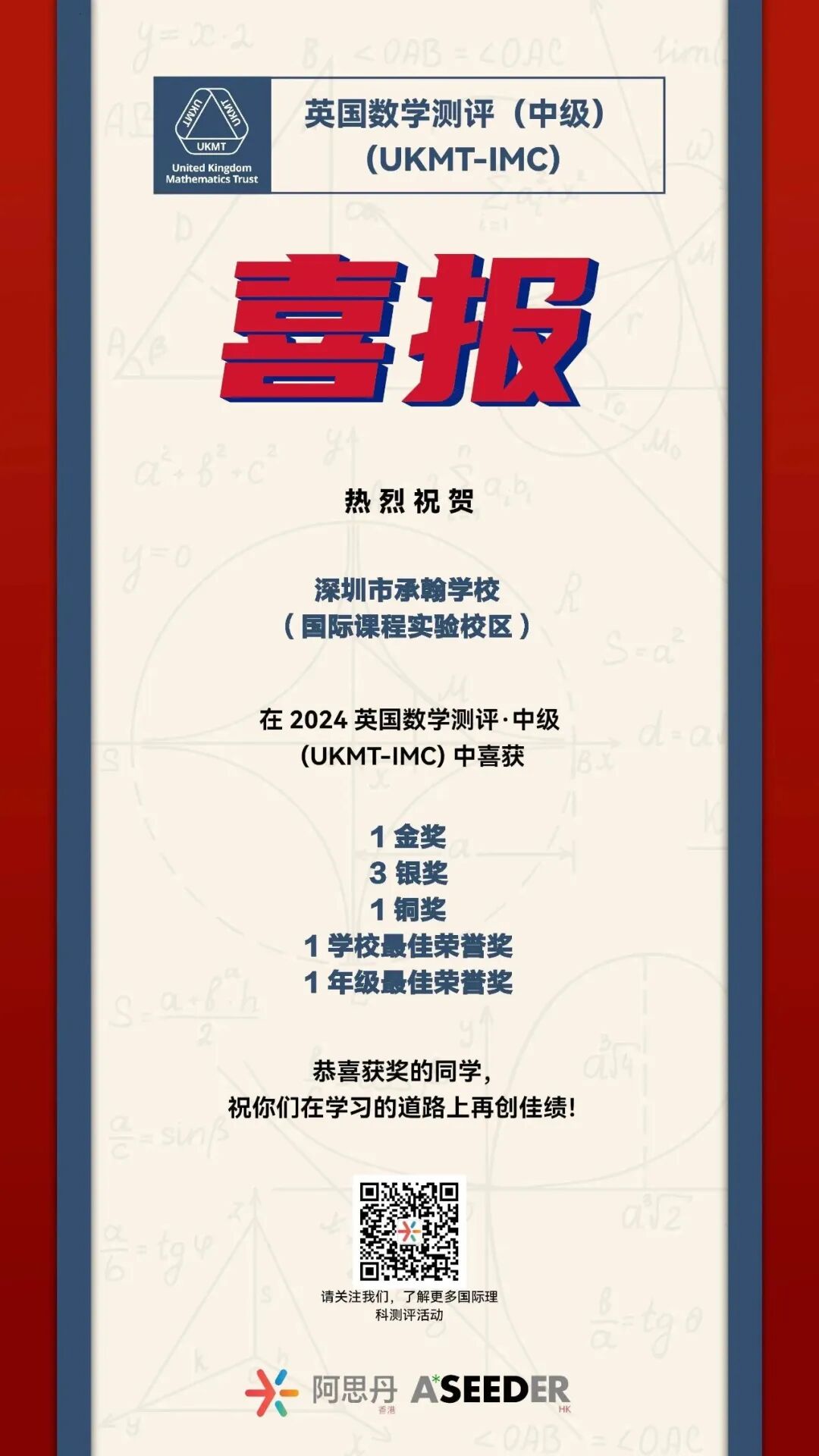 2024年英国数学测评-中级(UKMT-IMC)成绩也于近期揭晓,承翰学校国际课程中心的学子们喜得佳绩,斩获1项全球金奖、3项全球银奖、1项全球铜奖。并获得了学校最佳荣誉奖、年级最佳荣誉奖。