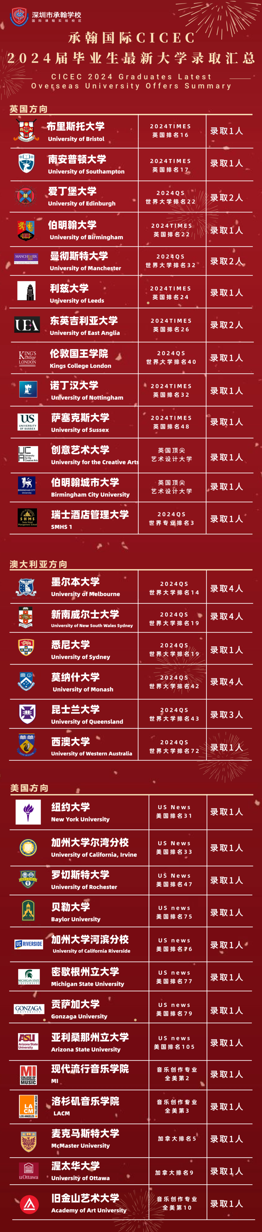 截止目前,承翰国际CICEC 2024届毕业生凭着卓越的学术表现和综合素养成功斩获了来自英国、美国、加拿大、澳洲和瑞士等多封世界顶尖学校录取信。其中世界排名TOP30的录取Offer近25%,近50%的录取来自世界排名TOP50的大学,艺术类院校专业均排名前三。